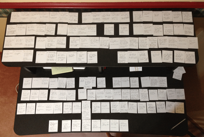 These are my index cards with every scene in the second draft of a screenplay I’m working on.